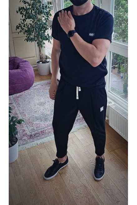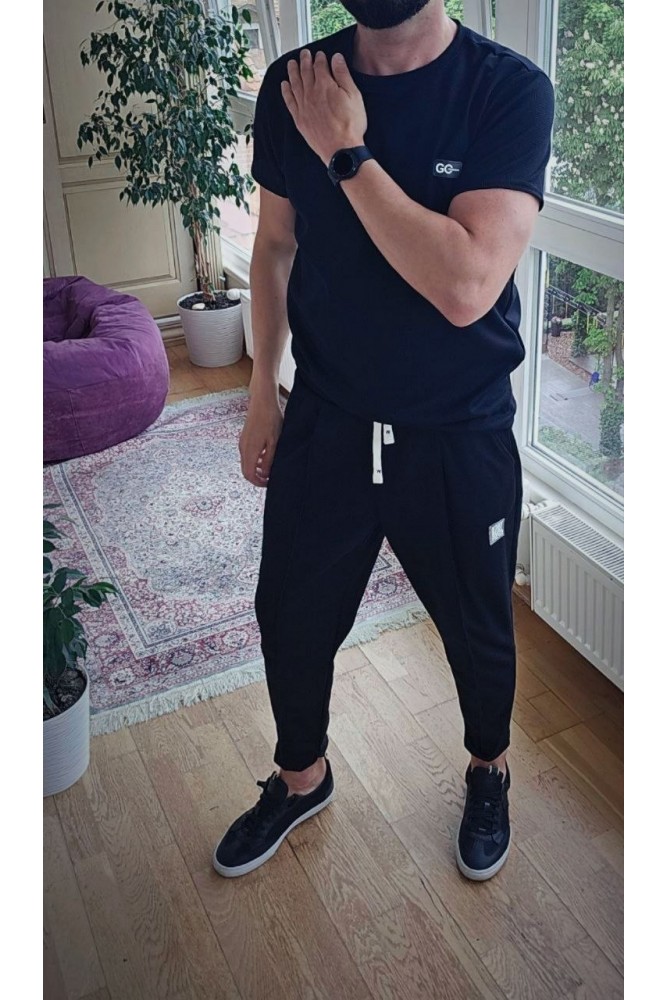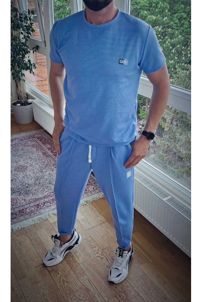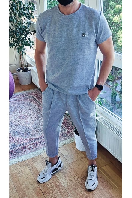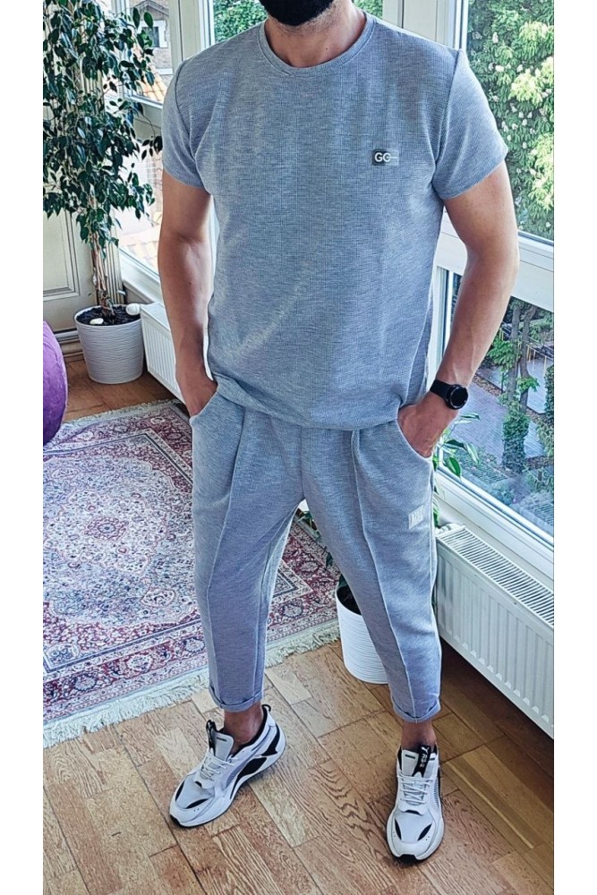 Футболка з фактурною текстурою,декорована силіконовою нашивкою на груднях.Штани з еластичним поясом,шнурком,бічними кишенями та силіконовою нашивкою.