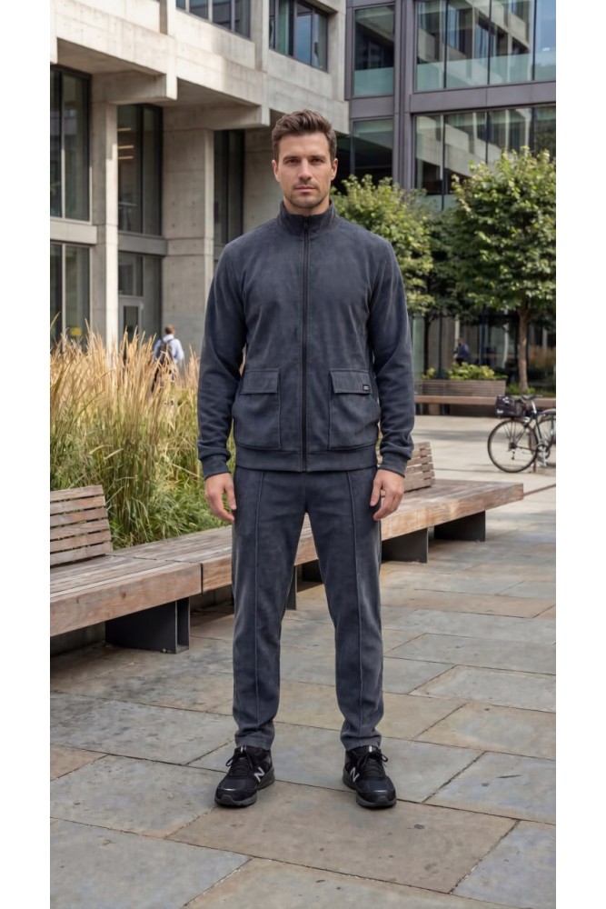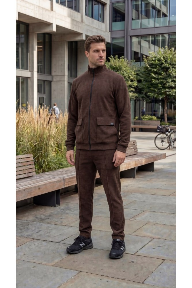 Чоловічий повсякденний костюм складається з куртки-бомбер на блискавці та прямих штанів. Костюм виконаний з м'якого матеріалу, Лакоста-вельвет, виробництва Туреччини