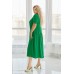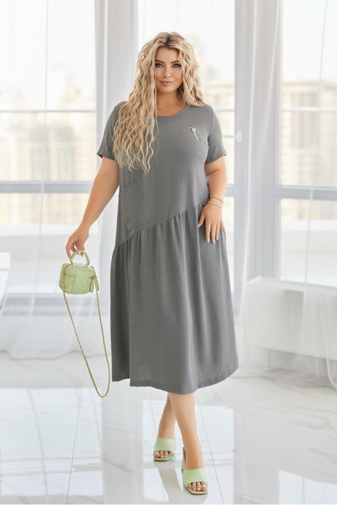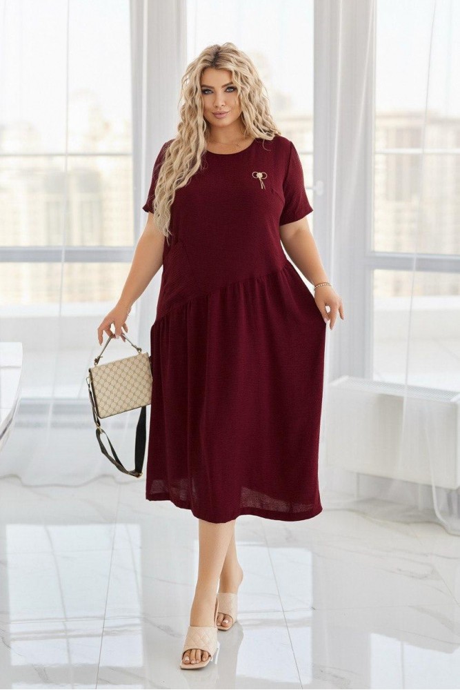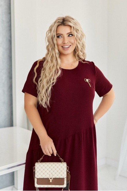 Сукня сучасного стилю, з косою лінією талії, прикрашена трендовою брошкою. Брошка може змінюватись.