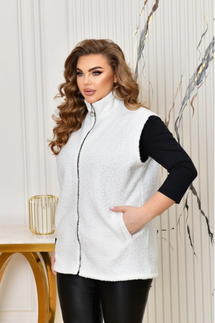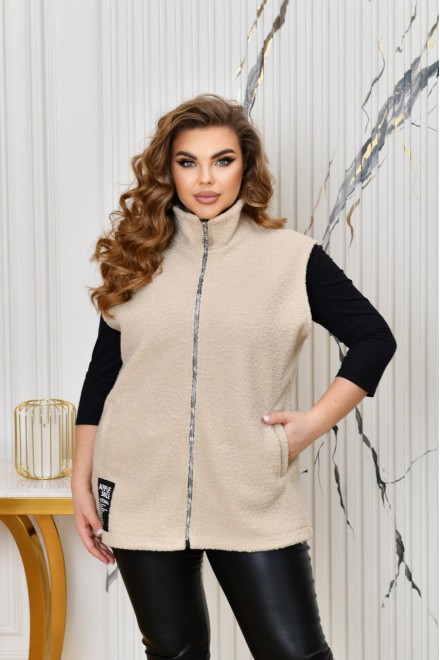 Актуальна стильна жилеточка із буклє «баранець» ( розтяжність мінімальна). Горловина з високою стійкою. Попереду оброблені прорізні кишені. Застібається на блискавку. Підкладу немає. Жилетка декорована якісною нашивкою.