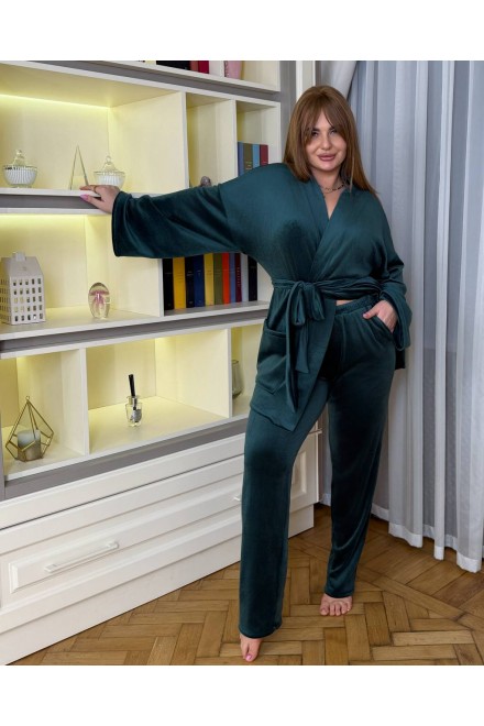 Кімоно вільного крою, на запах,з широкими рукавами та поясом,який красиво підкреслює талію.Штани прямого крою,із зручною резинкою на поясі та кишенями.