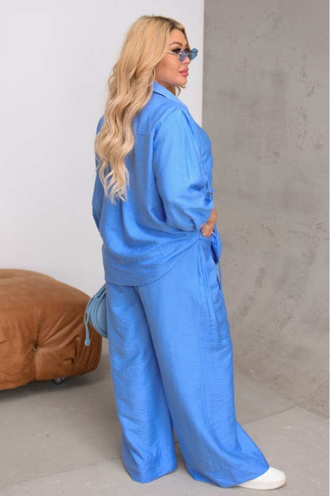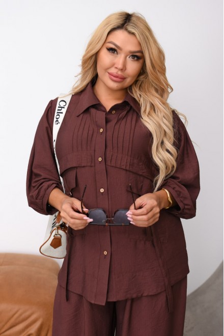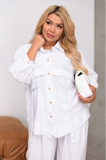 Вишуканий костюм, що поєднує комфорт, практичність і сучасний дизайн. Ідеальний вибір для повсякденних образів, роботи або стильних виходів — виглядає легко, але водночас елегантно.Сорочка вільного крою з накладними кишенями, декорованими клапанами зі стрічками, які плавно переходять до низу виробу та додають образу оригінальності. Перед оздоблений делікатними складками (“гармошкою”) в зоні грудей, що створює м’який, жіночний акцент.Застібається на ґудзики, рукав 3/4 із фіксацією на ґудзик — зручно та практично для щоденного носіння.Штани вільного крою з високою посадкою та еластичною резинкою на поясі забезпечують комфорт протягом усього дня. Бічні кишені додають практичності, а легкий силует виглядає сучасно та невимушено.Костюм легко комбінується як із класичним взуттям, так і з casual-варіантами — універсальна база гардероба.