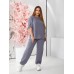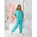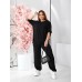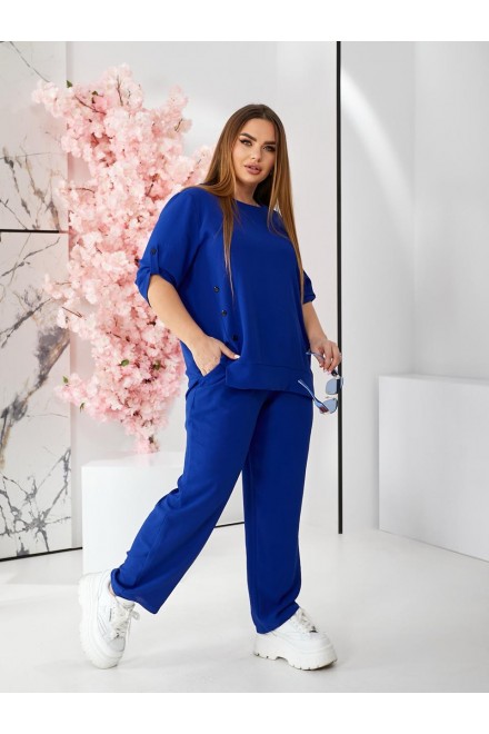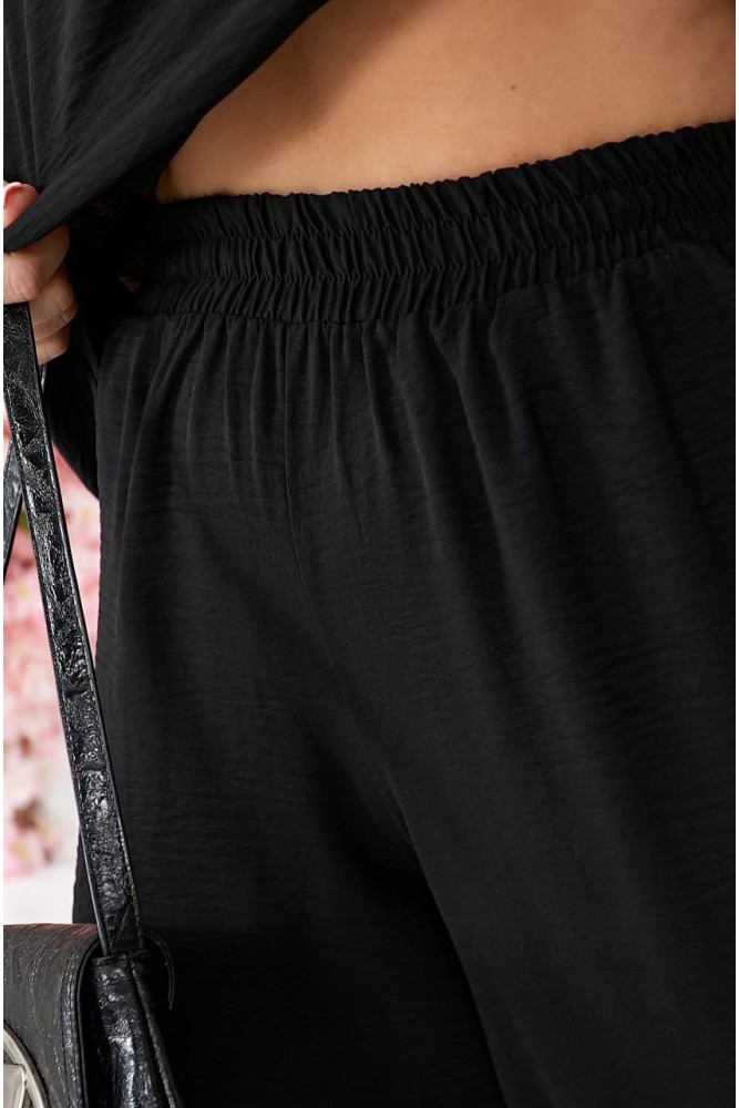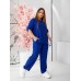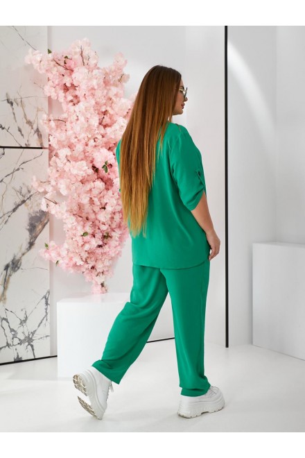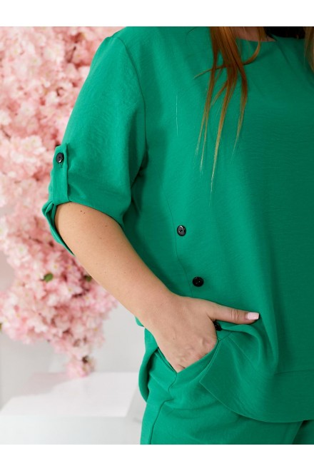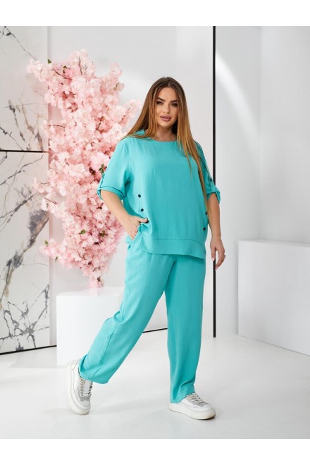 Блуза вільного крою з розрізами з боків та декоративними ґудзиками, довжина рукава регулюється патиком. Штани палаццо з високою посадкою, пояс на гумці.