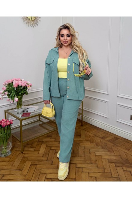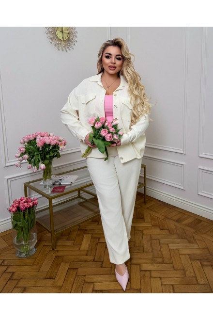 Костюм складається з сорочки-жакета на ґудзиках та зручних штанів із високою посадкою.