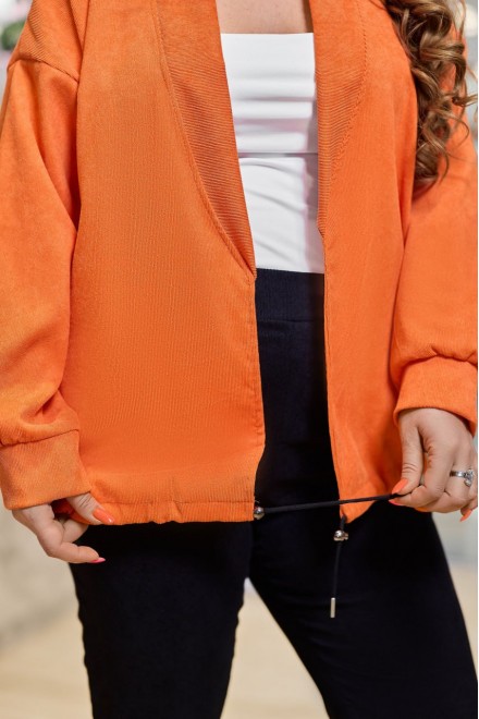 Розмір: 50-52, 54-56, 58-60. Колір: однотон-чорний, зелений, беж; верх-оранж, білий, електрик. Тканина вельвет. Жіночий комплект-двійка, що складається з жакету та штанів, які можна носити окремо один від одного, доповнюючи іншими предметами гардеробу. Жакет вільний, без підкладки та застібки. Крій легкий, що зберігає обсяг виробу. Рукав-реглан з манжетою по низу. Костюм комфортний у носінні на кожен день, створює жіночний та елегантний образ. Світла базова блуза або гольф освіжає комплект і додає потрібний контраст у верхній частині образу. Заміри: Розмір 50-52. Бомбер 75 см., рукав – 47 см. ОГ-від 110 см. Штани 107 см, ОБ - до 110 см, вн. шов-80 см. Розмір 54-56. Бомбер 76 см., рукав - 48 см. ОГ-від 120 см. Штани 107 см, ОБ - до 120 см, вн. шов-81 см. Розмір 58-60. Бомбер 77 см., рукав - 48 см. ОГ-від 130 см. Штани 108 см, ОБ - до 130 см, вн. шов-82 см.