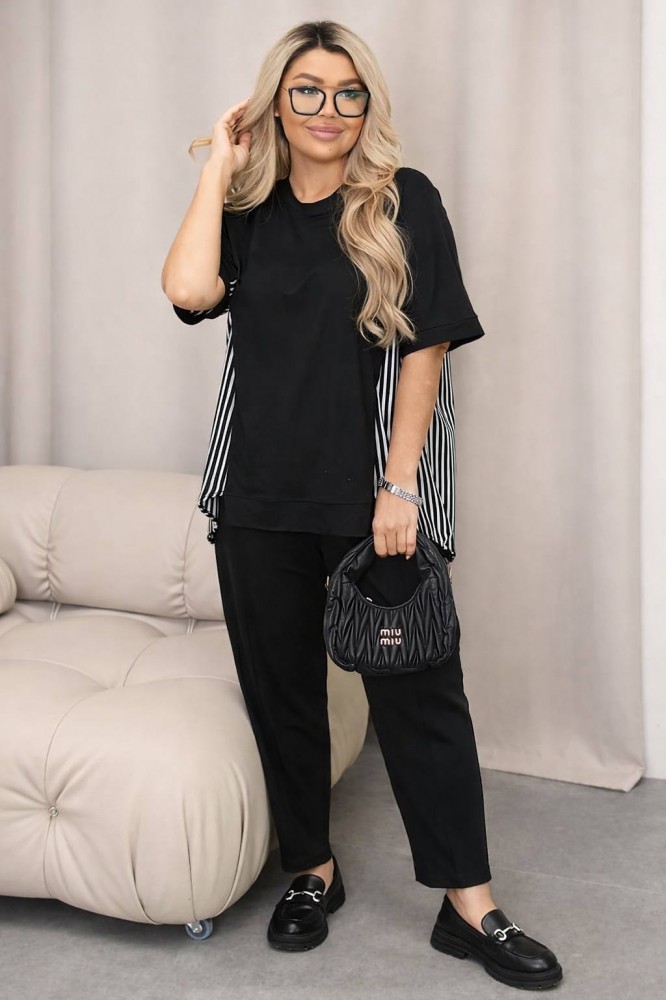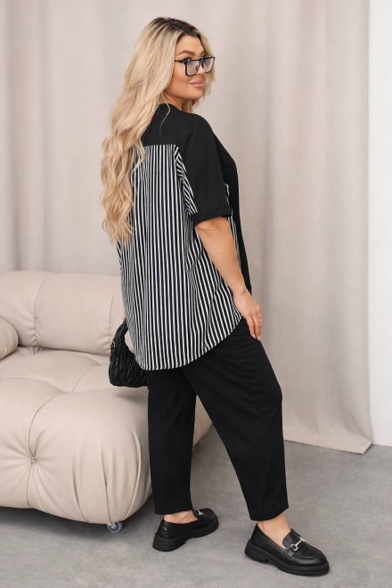 Кофта оригінального крою виконана з трикотажу з додаванням супер софта на спинці.Спинка подовжена .Штани середньої посадки на резинці.Штани з кишенями.Спереду стрілки ,які прикрашають вироб ,візуально видовжують Ваші ніжки і додають втрункості.Костюм дуже зручний і стильний.