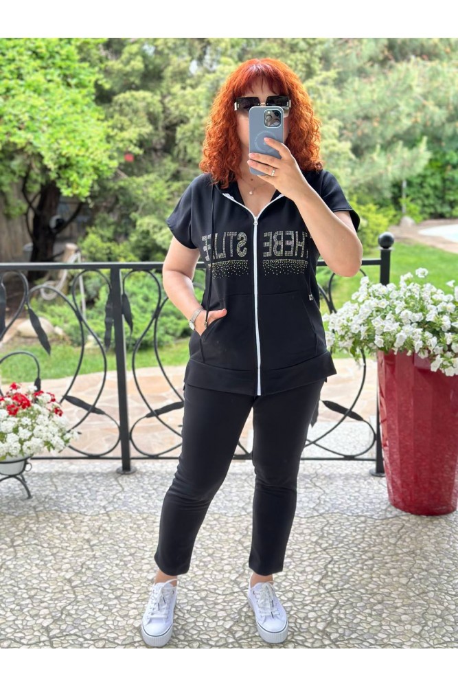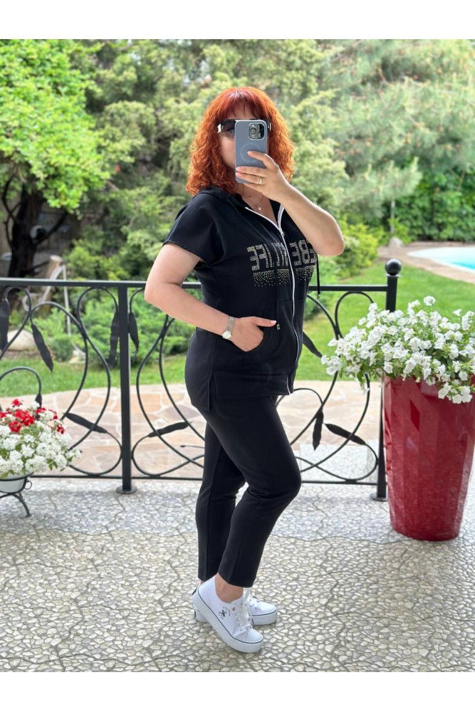 Куртка прямого силуету, з капюшоном, в куліску якого протягнуто шнурок. Застібається на блискавку. Рукав цільнокроєний, короткий. На передній полочці оброблено накладну кишеню. Низ асиметричний, з боків невеликі розрізи. Куртка декорована якісною аплікацією із стразів.